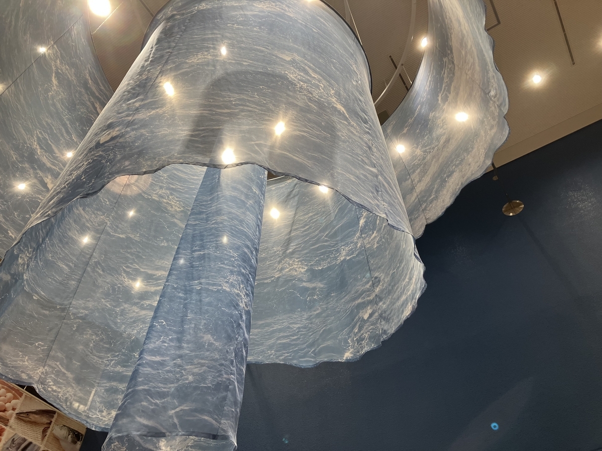 あと、玉ねぎのかつらも中にあったのでかぶって玉ねぎパネルの前にてみんなで記念撮影もしました。他には、玉ねぎネオンや玉ねぎピアノもあって玉ねぎづくしでしたが、施設名の通りうず潮の展示もありました。天井の布が綺麗でした。