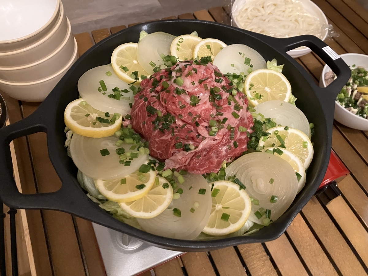 夜ご飯は玉ねぎレモン鍋をいただきました*5。玉ねぎもお肉も底までぎっしり、とろとろの玉ねぎも柔らかい牛肉も贅沢にたっぷり食べました。下の方にあったレタスも沁み沁みで美味しかったです。2月ということもあって外は寒かったので、バーベキューではなくお鍋にして正解でした。