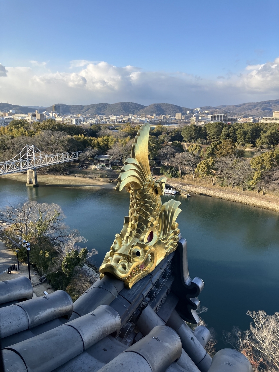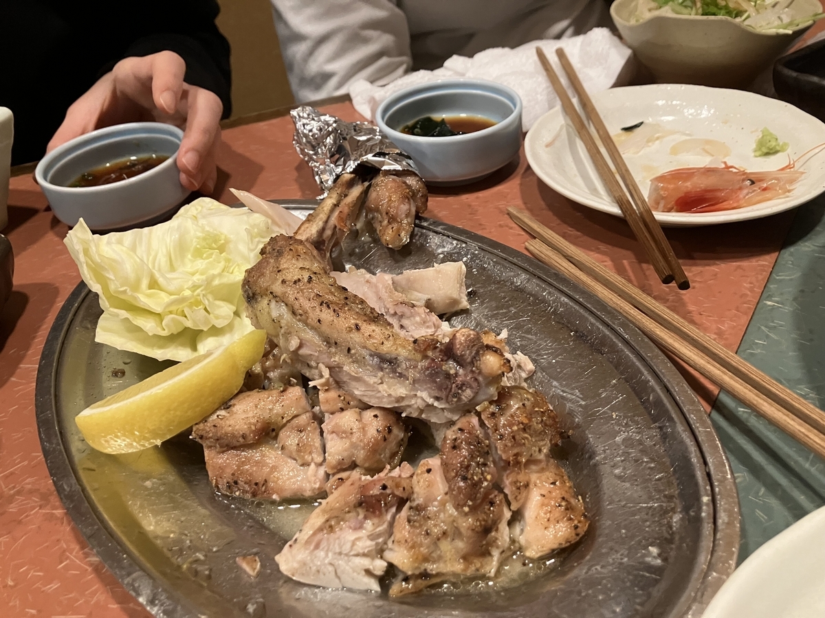 その後、レンタカーを乗り捨て(返却)し、海が見たいということで港まで歩きました。これが寒いのなんの、そして日没には間に合わず。(笑) 謎のオブジェで写真撮ったりしてわいわいしましたが寒すぎて早々に退散、高松駅周辺まで戻って、夜ご飯を食べました。レンタカー返却前にホテルにチェックインしていて、既に旅行支援クーポンは頂いていたので、居酒屋で消費しました。全くリサーチせずに適当に入ったので、もっと良いところはあったかもだけれど、香川といえばの鶏も四国だからの鰹も食べられたので満足です。