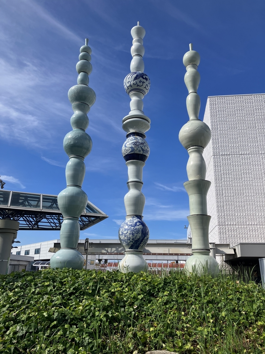 初っ端にこのチョイス、好きすぎる。陶芸とかできたらいいね~ろくろ回してみたいね~とか話してましたが、あまりに無計画だったので何もできず(事前予約が必要です)笑 様々な作家さんの作品・売り物を見て回りました。道にも大きな壺等が並んでいて、焼き物の町感いっぱいでテンション上がりました。ちなみにこちらは松山空港にあった砥部焼オブジェです。きれい。