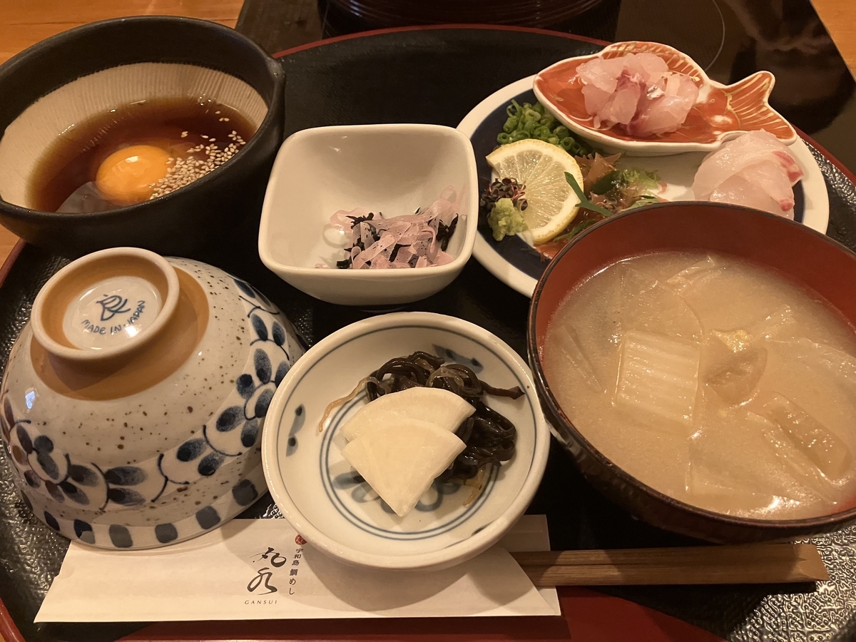 私は天然鯛と養殖鯛半々の食べ比べセットにしました。天然の方がコリコリしていて、養殖は柔らかく美味しかったです。高級な卵かけご飯…!