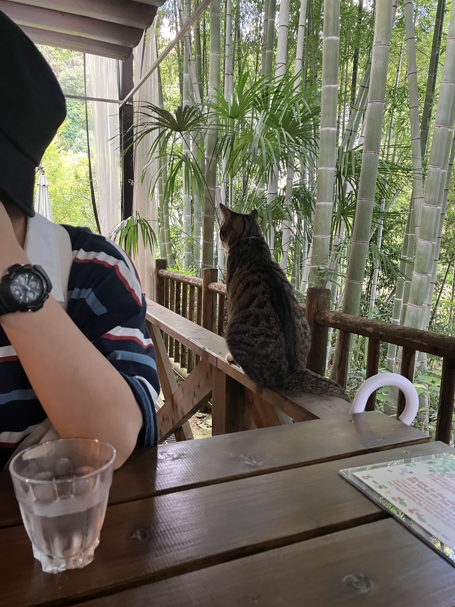 一休みしようかと併設の漱石珈琲店へ行き、お茶しました。建物の雰囲気が素敵でした。クリーム好きの猫ちゃんがデッキにいて可愛かったです。