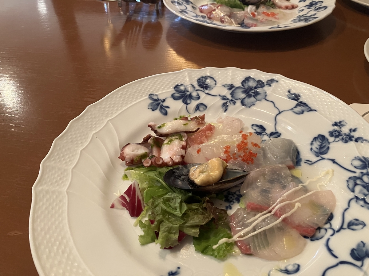 道後のホテルにチェックインし夜ご飯食べました。海鮮メインのフレンチです。味濃すぎず、量も多すぎずちょうど良かったですが、料理の出てくるスピードは遅かったかな…