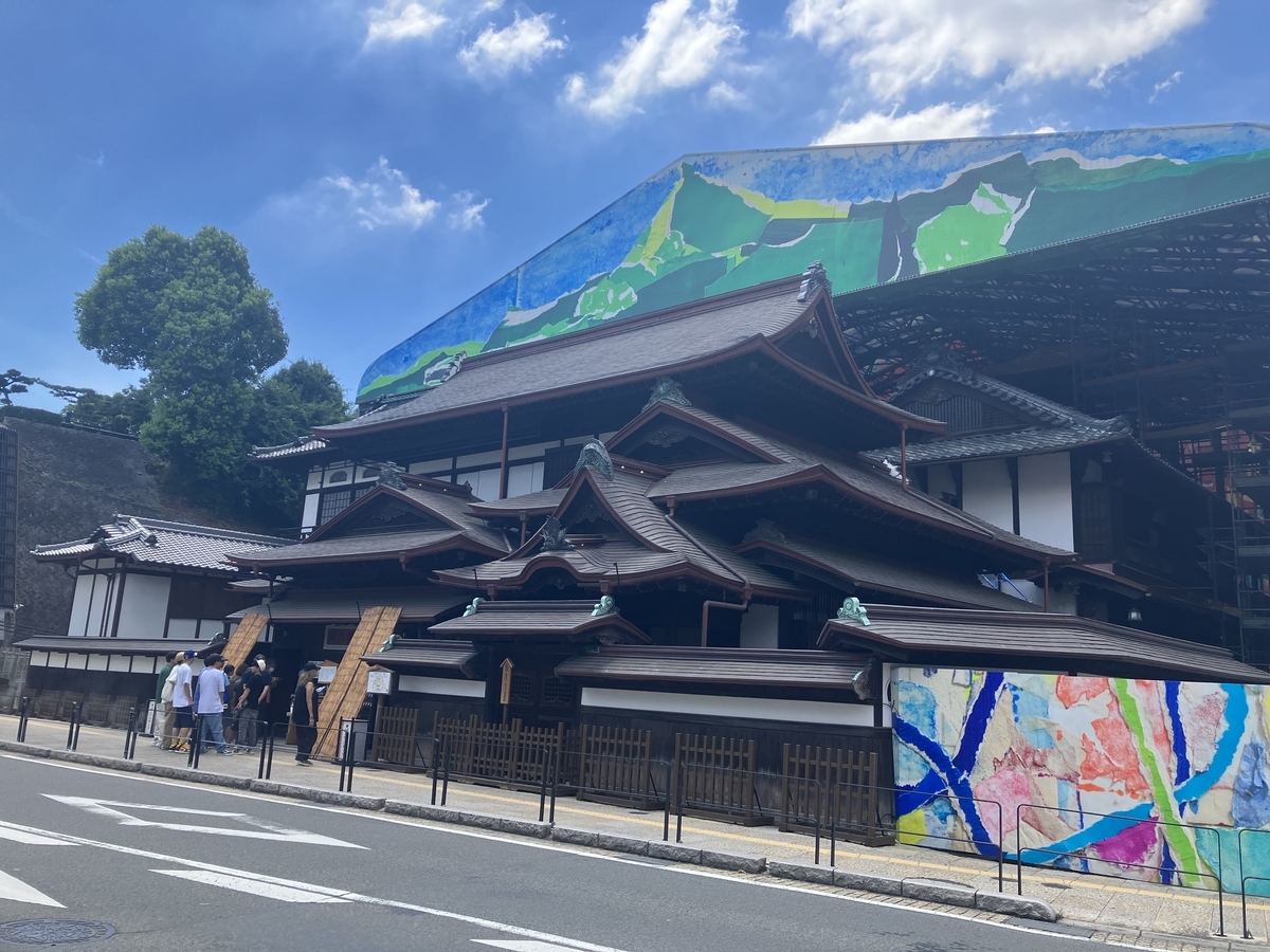道後温泉の商店街の方に戻り、みかんソフトクリーム食べたりしながらうろついていると後ろから御神輿が来て驚きました。大会に向けた練習だったらしいです。商店街抜けた先の所謂「道後温泉」の前で写真を撮りました。本館は工事中でしたが、前情報通り覆いが派手派手でテンション上がりました。